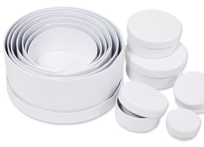 Boîtes rondes en carton, avec couvercles, couleur : blanc, contenu : 12 boîtes, dim. : 4–15 cm Ø, hauteurs : 1–6,5 cm.