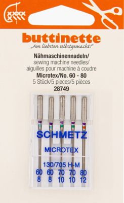 Les aiguilles "microtex" de buttinette ont une pointe fine et très pointe avec laquelle vous pouvez coudre des tissus microfibres, des tissus soie, des tissus organza, etc.