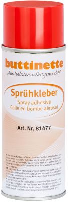 buttinette Colle en bombe aérosol, particulièrement adapté au modélisme, convient à toutes sortes de surfaces : papier, carton, photos, bois, métal, textiles, feutrine, mousse caoutchouc, cuir et plastique. Avec solvants. Contenu : 400 ml.