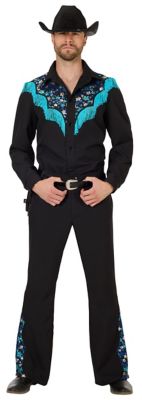 Vous avez toujours rêvé d'être un cow-boy et de partir à l'assaut du Far West, mais le marron n'est tout simplement pas votre couleur ? Alors ce costume de cow-boy noir et bleu est fait pour vous. Il allie le charme du cow-boy et un style moderne. Alors, mettez votre chapeau, montez à cheval et en route !