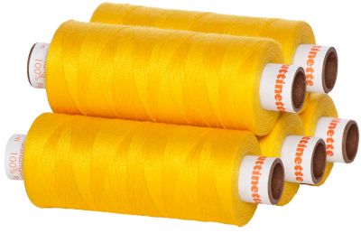buttinette Fil à coudre universel, couleur : jaune, grosseur du fil : 100, épaisseur d’aiguille conseillée : 60-100, contenu : 5 bobines, 500 m par bobine. Composition : 100 % polyester.