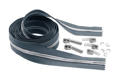 buttinette Kit de fermeture éclair à spirale sans fin, avec une large spirale aspect métal, non séparable, couleur du tissu : bleu/gris, largeur : spirale : 6,5 mm, bande : 30 mm, longueur : 2 m, 5 curseurs et 5 connexions inclus. Composition : bande en 100 % polyester, spirale en plastique, curseur en métal.