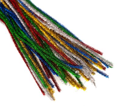 Fil chenille scintillant, épaisseurs : 5-6 mm, longueur : 50 cm, contenu : 50 pièces (couleurs assorties). Composition : 100 % polyester.