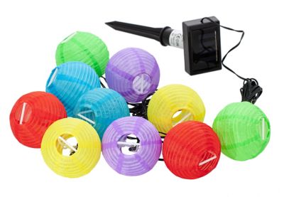 Guirlande lumineuse à lampions, 10 lampions LED, longueur totale : 4,5 m, longueur câble d’amorce : 3 m, écart lampions : 0,5 m, couleur lampions : multicolore, dim. lampions : 7 cm Ø, couleur lumière : blanc froid, linéaire, fonctionne à l’énergie solaire, bouton marche/arrêt, pour l’extérieur.