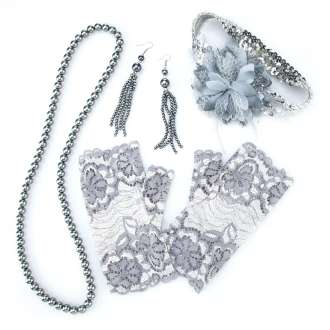 - contenu : bandeau à paillettes décoré d'une fleur en tissu et de plumes, gants dentelle, boucles d'oreilles, 1 collier de perles