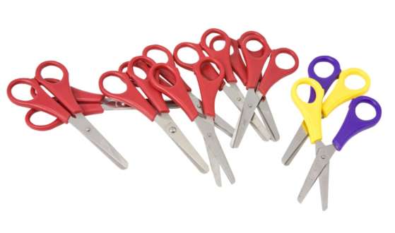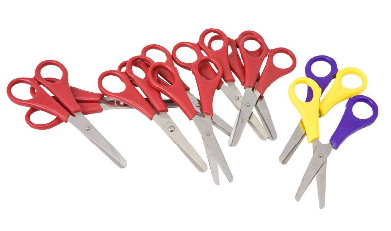 Lot de ciseaux pour enfants – prix avantageux ! 8 ciseaux pour enfants droitiers et 2 ciseaux pour enfants gauchers, avec poignée en plastique adaptée aux petites mains, bouts ronds et graduation en cm, longueur 13 cm.