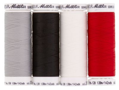 Mettler Lot de fils à coudre Seraflex "Couleurs de base", couleurs : gris, noir, blanc et rouge, épaisseur d'aiguille : 70-80, grosseur du fil : 120, contenu : 4 bobines de 130 m. Composition : 100 % polytéréphtalate de triméthylène (PTT).