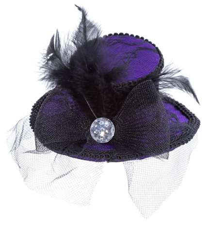 Que vous soyez sorcière, vampire ou lady gothique, ce mini chapeau est tout simplement parfait ! Le violet sombre flatte toutes les amatrices de mystère, et un simple ensemble noir devient tout de suite festif ! La dentelle noire, le tulle, les plumes et les strass font de ce mini-chapeau un accessoire élégant qui ne doit pas manquer sur votre tête cette saison de carnaval. Alors, mettez votre chapeau et direction la prochaine fête !