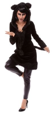 Robe "panthère", noir, en panne de velours et imitation fourrure, avec capuche avec oreilles et pompons en imitation fourrure, avec une queue sur l'arrière, fermeture à glissière latérale, longueur de la robe pour la taille 36/38 : env. 85 cm.