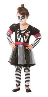- détails : robe imprimé squelette, élastique, fermeture éclair au dos; jupe en tulle à paillettes et roses en tissu amovible, scratch au dos; legging taille élastique