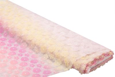 Tissu tulle fin "fleurs en 3D", couleur : blanc/coloré, extensible en largeur, transparent, dimension grande fleur : 3,5 cm Ø, largeur : 125 cm, poids : env. 50 g/m². Composition : 100 % polyamide.