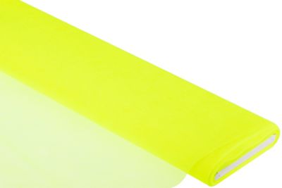 Tissu tulle avec traitement ignifuge, couleur : jaune fluo, alvéoles : 1,5 mm Ø, largeur : 145 cm, poids : env. 20 g/m². Composition : 100 % polyamide.